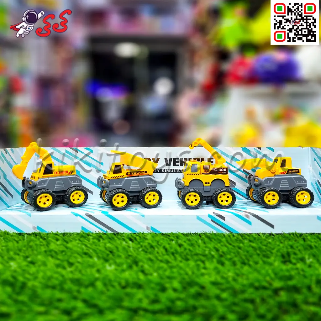 این اسباب بازی یک ست 4 عددی ماشین فلزی طرح راهسازی می باشد که شامل چهار مدل می شود. جنس رویه این ماشین از فلز با تکنولوژی دایکاست می باشد و دارای رنگ آمیزی براق و با کیفیت به رنگ زرد می باشد. در این مدل های ماشین قسمت زیرین و چرخ های ماشین ها از جنس پلاستیک با کیفیت بالا ساخته شده است. اندازه طول این ماشین ها در حدود 6 الی 6.5 سانتیمتر است و برای بازی کودکان مناسب می باشد. این ست شامل ماشین هایی مانند کامیون ، بیل مکانیکی ، بولدوزر و یدک کش است که یک مکانیزم کوچک بر روی آن قابلیت حرکت دارد. روکش لاستیک های ماشین هم به رینگ کاملا چسبیده است و کودک نمی تواند آن را جدا کند و کودکان براحتی می توانند با این محصول بازی کنند. این ماشین بصورت عقب کش است و قابلیت پخش موزیک و نور ندارد .