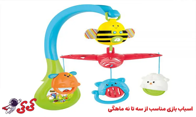 همانطور که گفتیم اسباب بازی مناسب از ۳ تا ۹ ماهگی اسباب بازی است که دارای رنگ روشن باشد موسیقی ایجاد کرده یا بتواند حرکت کند و از خود نور پخش کند تا بتواند توجه کودکان را در این سن به خود جلب کند. در این قسمت به معرفی چند نمونه از اسباب بازیهایی که مناسب کودکان در این سنین باشند خواهیم پرداخت.